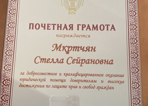 В 2023 году Федеральная палата адвокатов РФ наградила меня Почетной грамотой. Для меня эта награда — важный знак. Знак того, что я двигаюсь в верном направлении: помогать людям честно, с душой и на высочайшем профессиональном уровне.